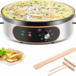 This image shows the Ethniq 16″ Non-Stick Electric Griddle. A crepe is being cooked on the griddle. The griddle has a non-stick surface. It also features cool-touch handles for safe use. Overheat protection is a key safety feature. The griddle also comes with two wooden spatulas.