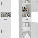 Standing at an impressive 67 inches, the Homhedy Narrow Floor Cabinet is more than just a piece of furniture; it’s a slender sentinel guarding your home’s most precious and personal spaces. This tall, greige storage unit, with its charming barn doors and a single, smooth-gliding drawer, is a master of disguise, seamlessly blending into any room. It can effortlessly find its place in the tightest corners of your bathroom, kitchen, or even a cozy entryway. The adjustable shelves within its narrow frame are like silent servants, ready to adapt to your every whim, so whether you’re stashing fluffy towels, pantry staples, or a collection of decorative trinkets, this cabinet can hold it all. In fact, its versatile design and subtle sophistication make it a stylish solution for anyone seeking both function and form.