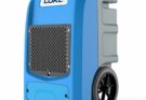This image shows a LUKO brand industrial dehumidifier. It has a blue and gray body. It is portable with two large wheels and a metal handle. The unit has dimensions of approximately 35 inches tall, 22 inches wide, and 22 inches deep. The front features a large black grate for air intake.