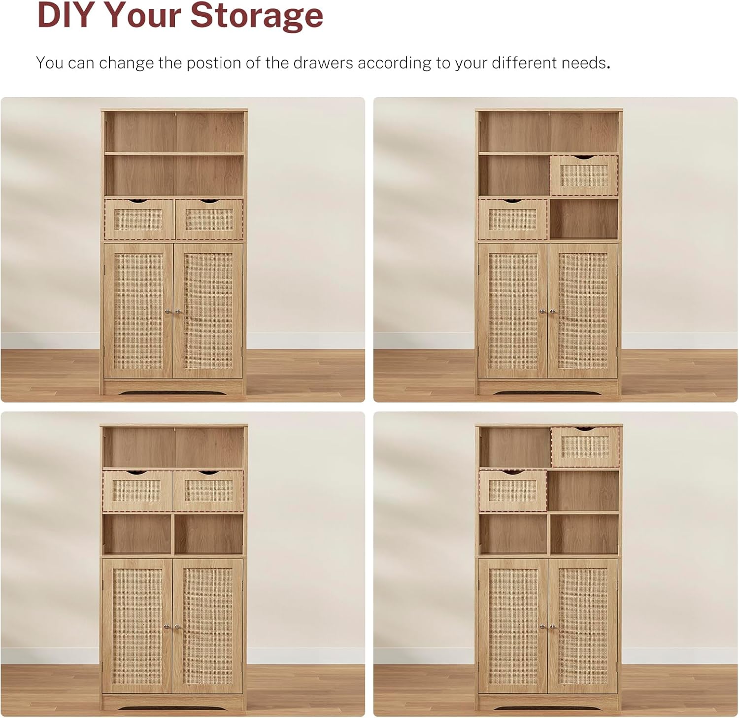 The TEENFON 2-Door Rattan Cabinet offers a flexible storage solution. It features adjustable drawers that can be moved to different positions within the shelving unit. This allows you to customize the cabinet’s layout to suit your specific storage needs. The design is simple and versatile.